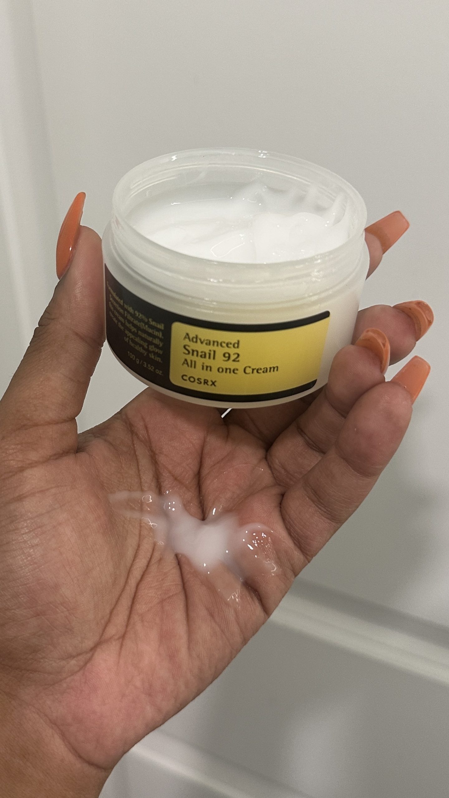 Since I already love the COSRX Advanced Snail 96 Mucin Power Essence, my expectations for this cream were high. It’s marketed as a do-it-all moisturizer that deeply hydrates, supports skin repair, and improves texture. And yes, I’ve been saying snail, and I mean exactly what you’re thinking. Snail secretion filtrate, snail slime, is a concentrated, filtered version of the mucus snails naturally produce. It’s known for helping with hydration, healing, and elasticity. I’d already gotten over the mental hurdle of putting snail slime on my face after seeing how well the essence worked, so I had no hangups about trying this one too.